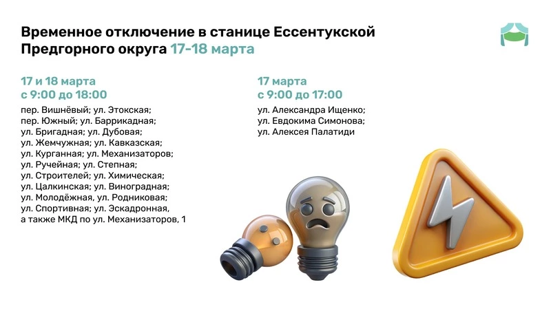 В других районах электричества не будет два дня подряд с 9:00 до 18:00 17-18 марта. В зону отключения попадут переулки Вишнёвый и Южный, улицы Этокская, Баррикадная, Бригадная, Дубовая, Жемчужная, Кавказская, Курганная, Механизаторов, Ручейная, Степная, Строителей, Химическая, Цалкинская, Виноградная, Молодёжная, Родниковая, Спортивная и Эскадронная. Также меры затронут многоквартирный дом по улице Механизаторов, 1.